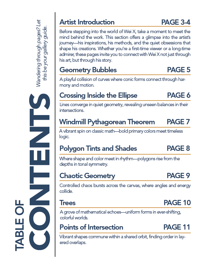 o translate Wei X.’s mathematical art into a tangible reader experience. My aim was to ensure that every page—from the table of contents to the deep-dive artist bio—maintained a strict geometric grid, mirroring the art itself while providing a clear, accessible path for museum visitors to follow.